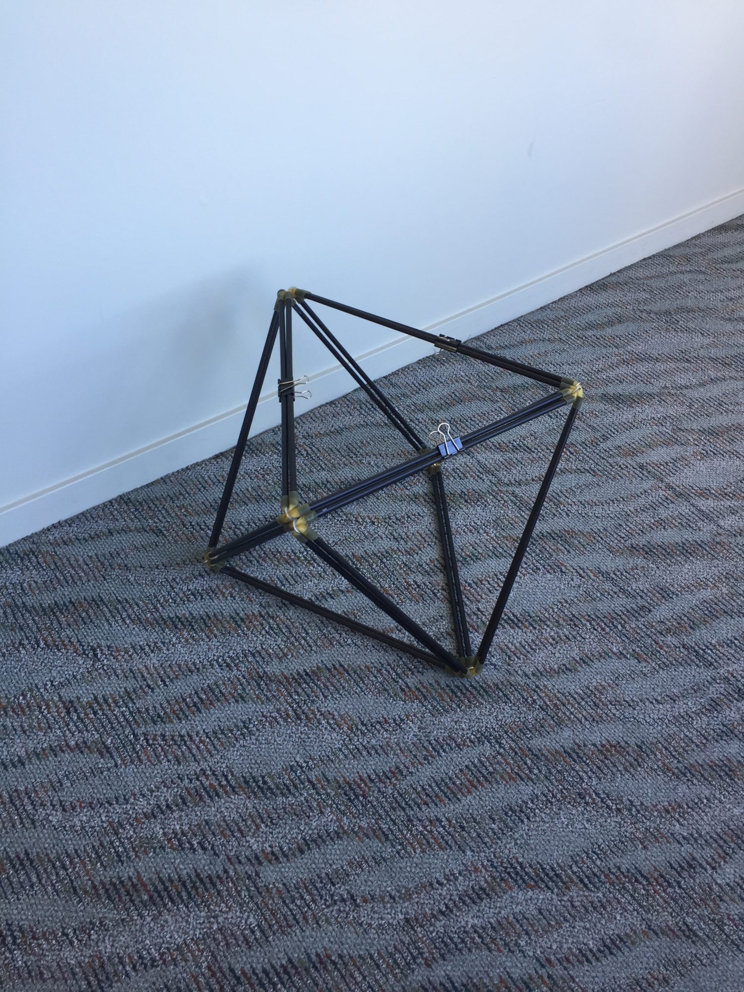The last pic shows halfway collapsed mode, where it renders an Icosahedron (if you imagine chords connecting the short way across each of the eight diamonds. In this pic, there is one closest to the camera, the chord would start at the node near the person’s thumb.
