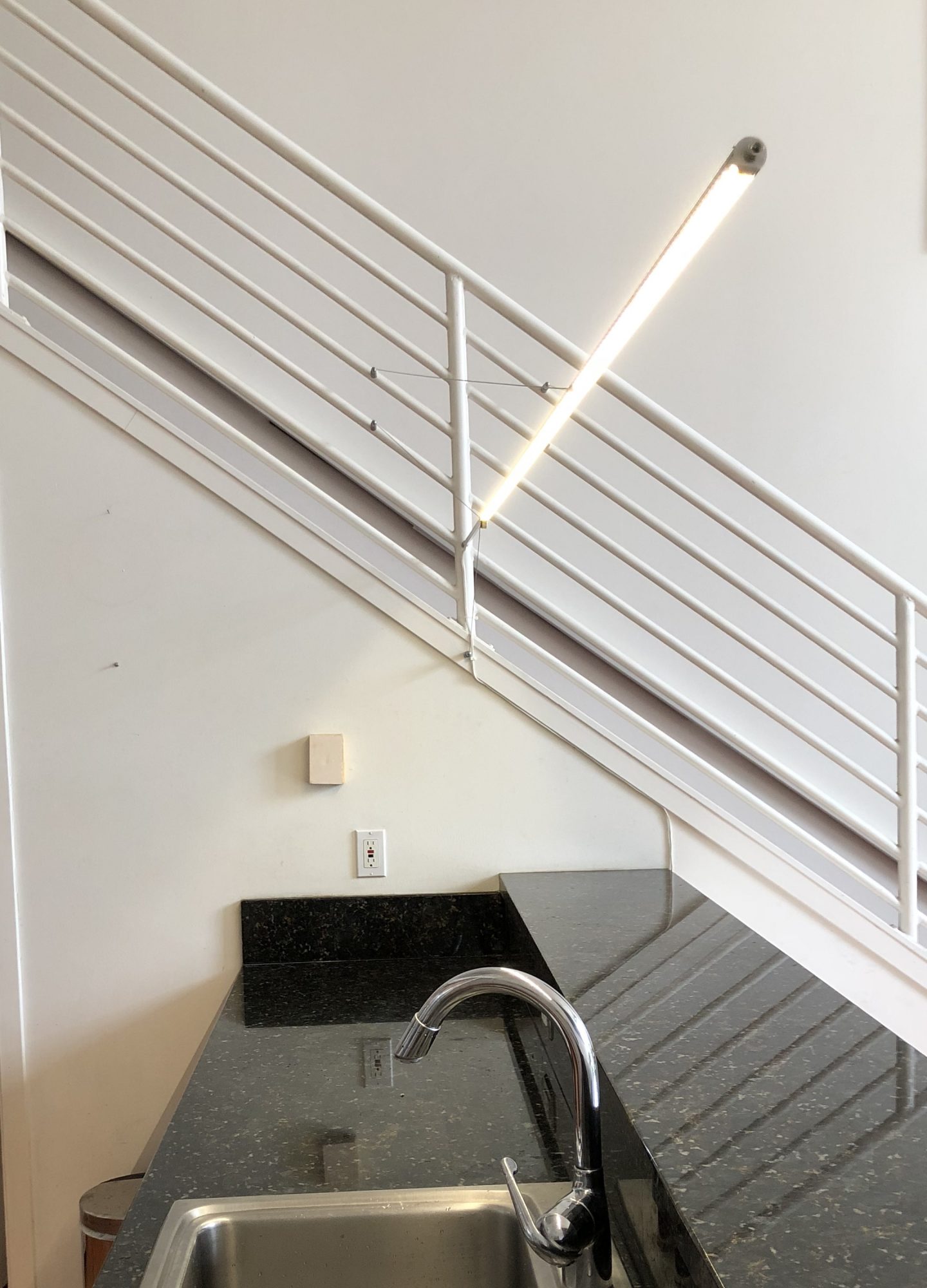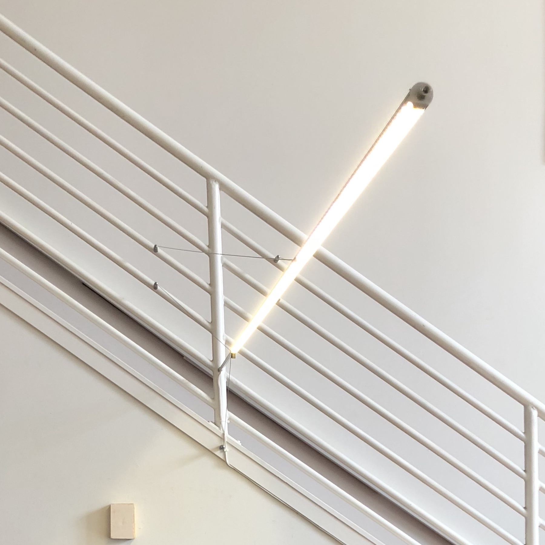 A linear LED lamp, suspended in air in the manner of a cable-stayed suspension bridge.