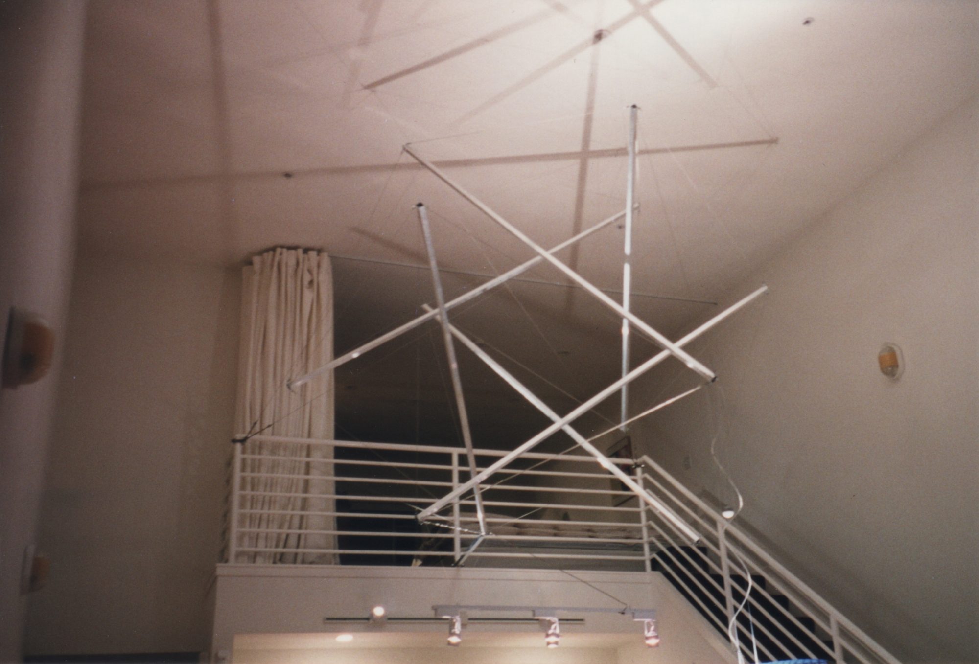 My first Tensegrity sculpture, consisting of six 8-foot aluminum rods connected into a rigid spherical shape by 24 tendons of stainless-steel aircraft cable. The resulting shape is (approximately) an Icosahedron (fully symmetrical platonic solid of 20 triangles). The entire sculpture was suspended in a loft space and lit from below to cast dramatic shadows.